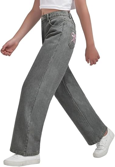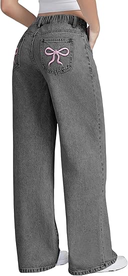 Girls Wide Leg/Flare Jeans Bow Embroidery/Leopard Print Denim Pants with Pockets Casual (Pant 5)