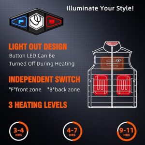 【Light ON/OFF & Independent Switch】WASOTO heated vest switch design is simple and generous, easy to operate, short press “F” and “B” to control the front and back heating area respectively. Double press center button to turn off the LED light on switch, while keeping the heating mode on.