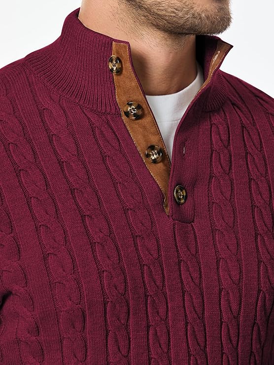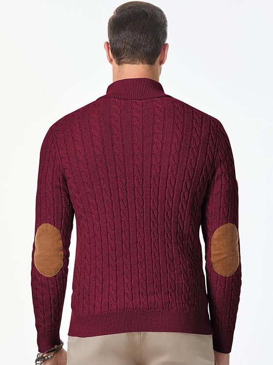 Unique Design: Casual sweater for men features button-up neck, stand collar, chunky warm, basic simple design. The collar and elbows are accented with suede patches, and it includes high-quality button closures.