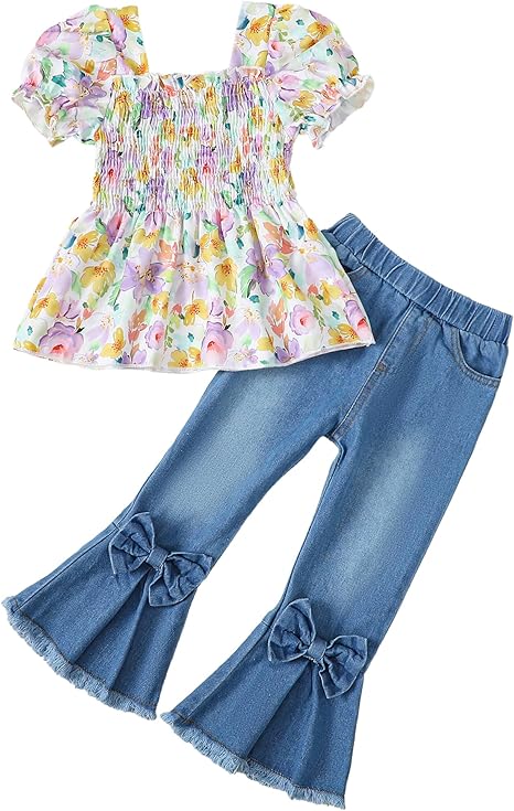 - Cute and Trendy: This two pieces girls outfit includes a ruffle peplum top with square neck and puff sleeves we love,and pull on denim jeans with elastic waist. A top choice for little girl spring summer clothes,that’s sure to get compliments.