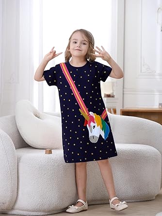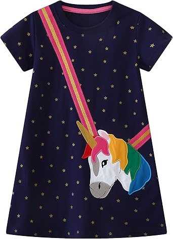 【EXQUISITE DESIGN】: Our short sleeve cartoon dress come with well-made printed and embroidered patterns such as dinosaur, unicorn, peacock, flamingo, butterfly, carrot and strawberry etc. They are very suitable for sweet and cute little girls. The stitching of girls’ casual dress is neat and dense, highlighting the good quality of the clothes.