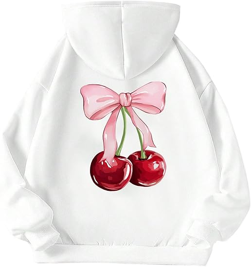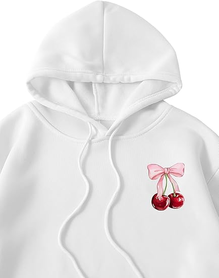 Long Sleeve Hooded Sweatshirt Thick Graphic Hoodie Cute Pullovers Tops(White and Cherry)