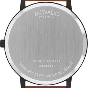 - Movado Face, 41mm black ion-plated stainless steel case with a black dial on a cognac leather strap.