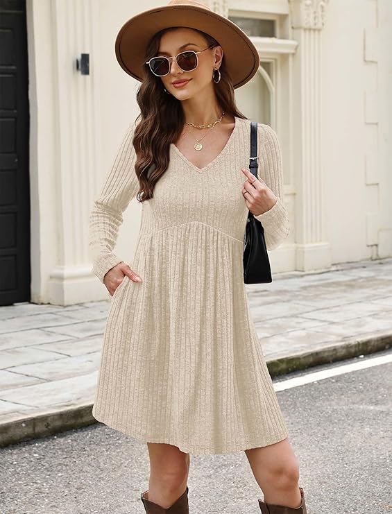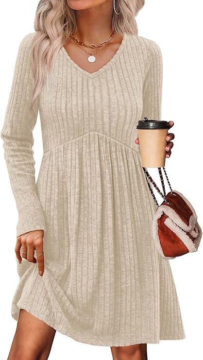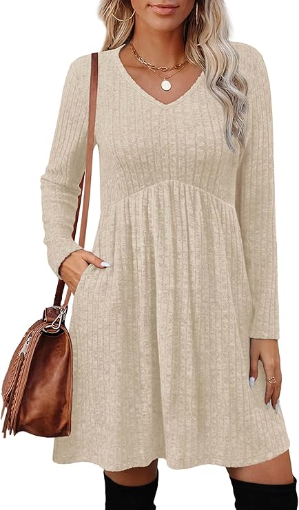- FEATURES: v neck sweater dress, long sleeve, empire waist, babydoll design, above knee length, dressy casual, flowy fall fashion tunic dress, loose and flattering dresses to hide belly fat well.