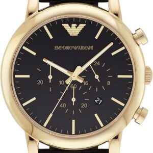- An oversized black dial with stainless steel accents and a black genuine leather strap give this Emporio Armani watch a cool, metropolitan look.