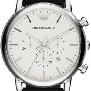 - An oversized black dial with stainless steel accents and a black genuine leather strap give this Emporio Armani watch a cool, metropolitan look.