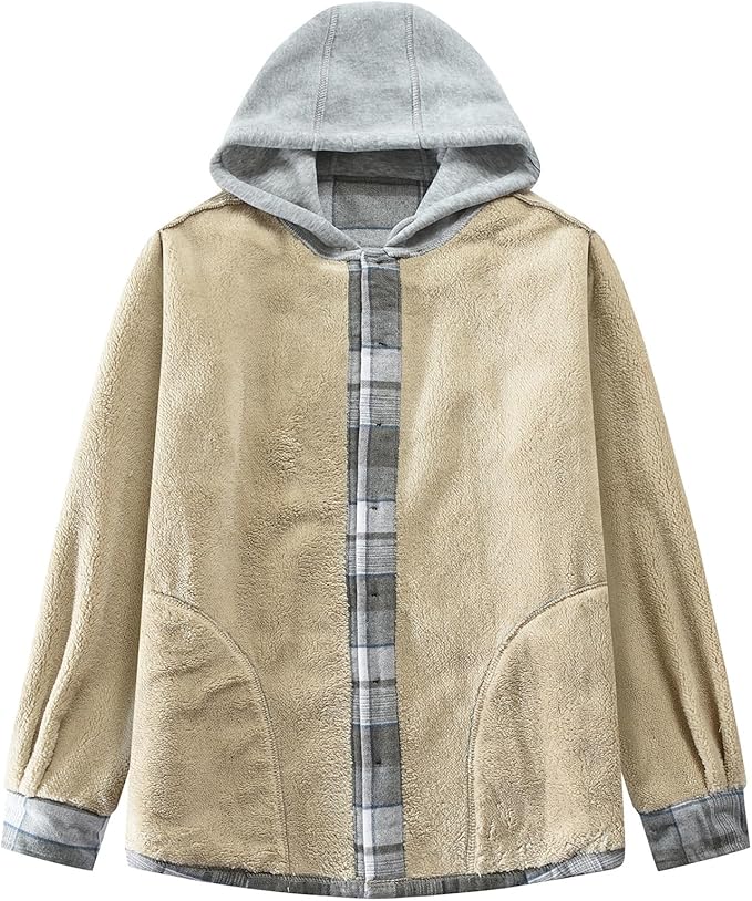 Features: Button, long sleeves(The sleeves lined), 2 side pockets, drawstring hood, plaid element outer and fuzzy fleece inside, to provide extra warmth and comfort.
