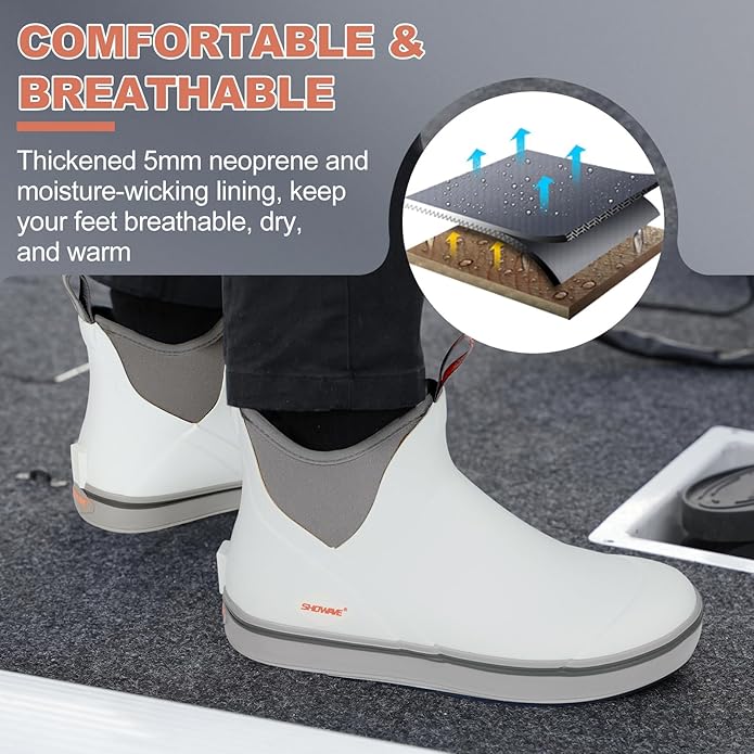 - COMFORTABLE & BREATHABLE: Are you ready to have a more comfortable and functional shoe? Our shock-absorbing sports insoles provide scientific arch support and relieve muscle fatigue via feet massage, making them plusher for people of all weights or overweight individuals. Further, the deck fishing boots with breathable soft mesh liner are moisture-wicking, keeping you comfortable in both cool and warm environment.