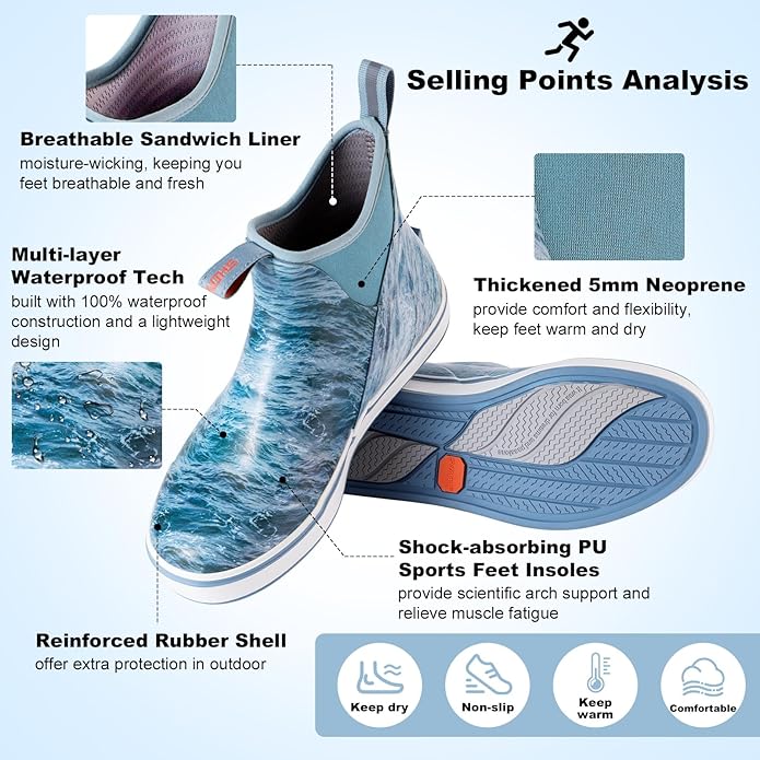 - COMFORTABLE & BREATHABLE: Are you ready to have a more comfortable and functional shoe? Our shock-absorbing sports insoles provide scientific arch support and relieve muscle fatigue via feet massage, making them plusher for people of all weights or overweight individuals. Further, the deck fishing boots with breathable soft mesh liner are moisture-wicking, keeping you comfortable in both cool and warm environment.