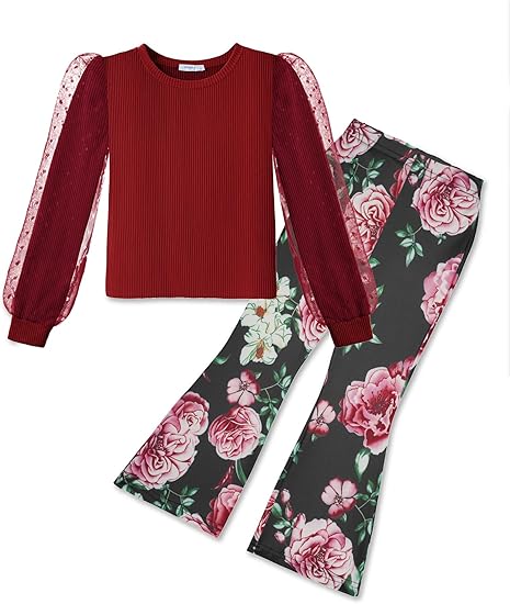 Toddler Girls 2 Piece Outfits Fall Clothes Knit Tulle Puff Sleeves Top and Flare Pants Set (Deep red Flower)