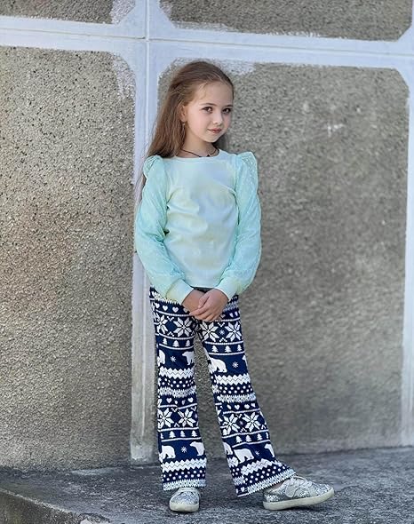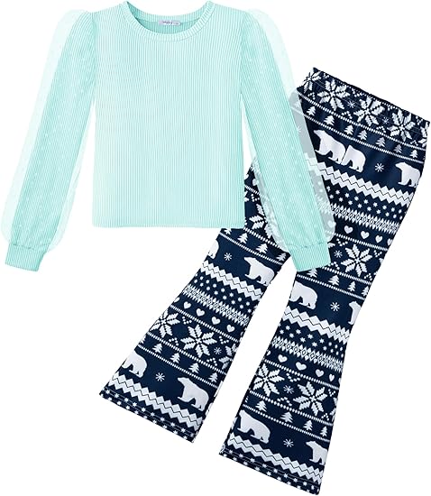 - Design: Cute Clothes for Girls featuring crew neck knit top designed with tulle puff sleeves,unique and fashionable, perfectly matched with the flare Pants. Different prints look particularly pretty and cute, adding a sophisticated design sense to your child’s daily clothing