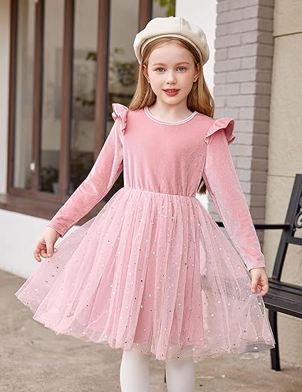 Toddler Tutu Dresses Little Girls Velvet Tulle Fall Winter Long Sleeve Ruffle Holiday Party Dress (Pink)