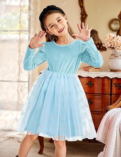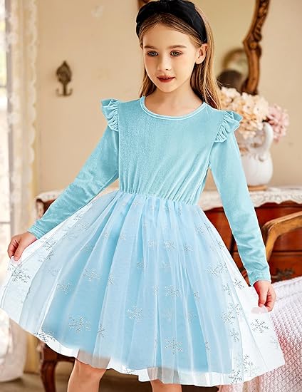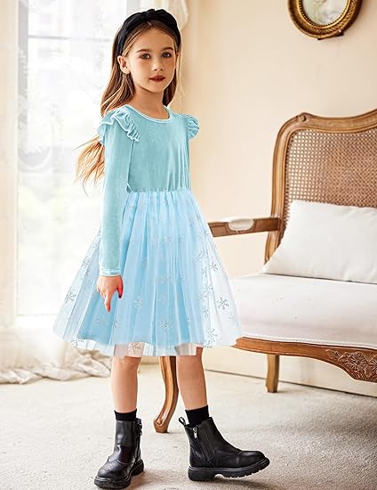 Toddler Tutu Dresses Little Girls Velvet Tulle Fall Winter Long Sleeve Ruffle Holiday Party Dress (tale blue)