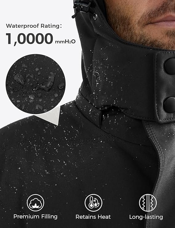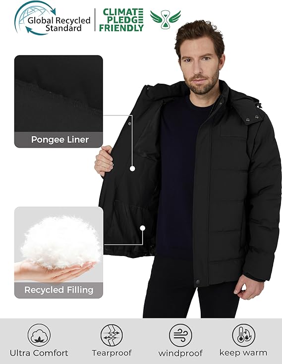 Recycled Fabric and Insulation – The winter jacket for men is not only made with recycled fabric, but it also has a 10000mm waterproof rating that keeps you dry in the rain or warm in snowy weather at all times.