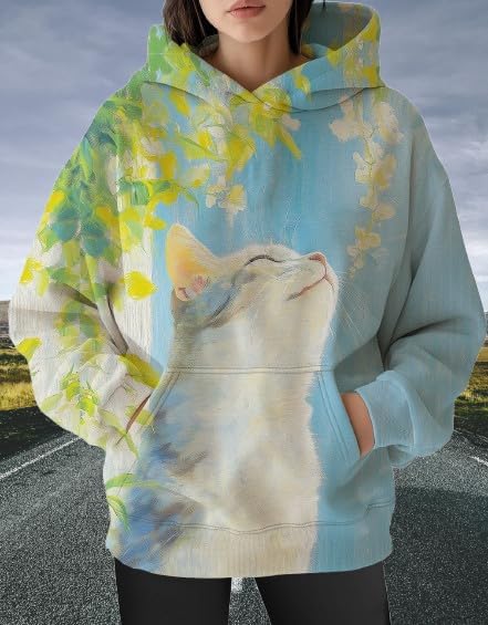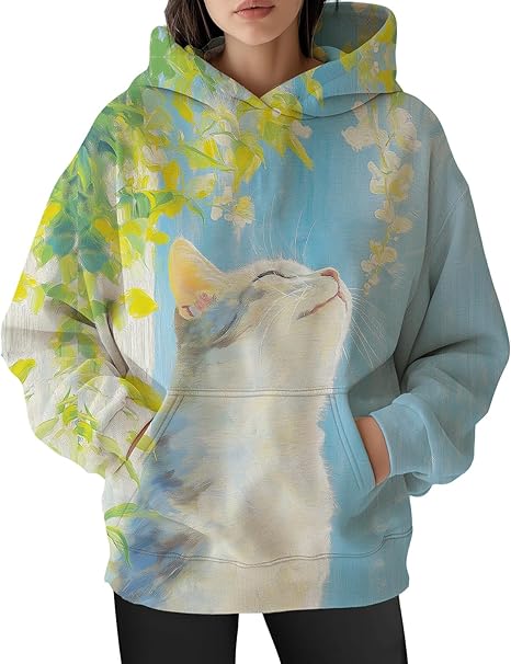 - Features: The oversized hooded sweatshirt is printed with cute funny cat, which is designed for cat lovers. Long sleeve, kangaroo pocket, hooded sweatshirt, causual loose fit for daily wear.