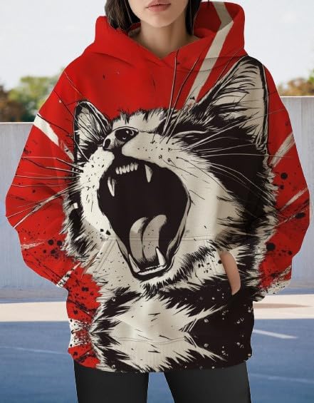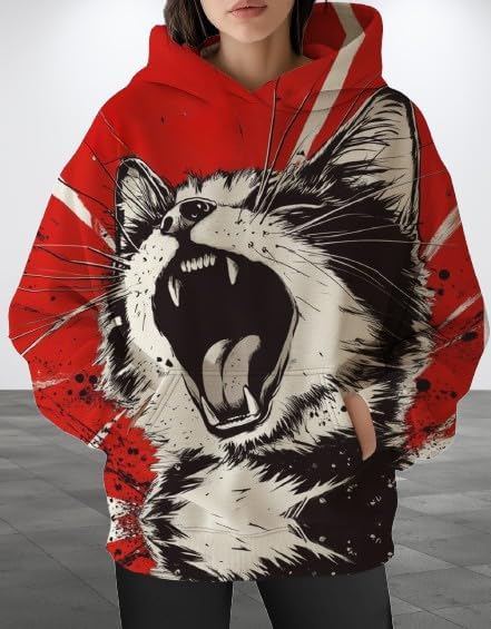 Womens Funny Cat Hoodies Oversized Graphic Hooded Sweatshirt for Women Fall Plus Size Pullover Hoodie Y2K(Red)