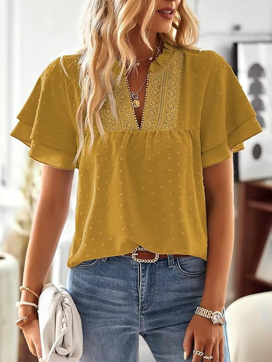 - Features: Womens tops dressy causal, v neck, Butterfly short sleeve, Crochet Lace Edges, Swiss Dots Detailing, non-transparent fabric make the casual tops for women look more fashion and chic.