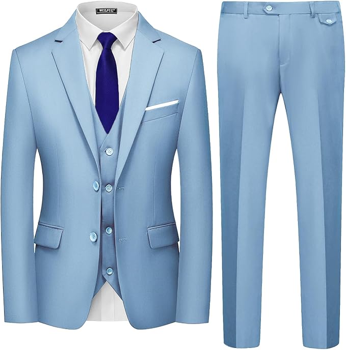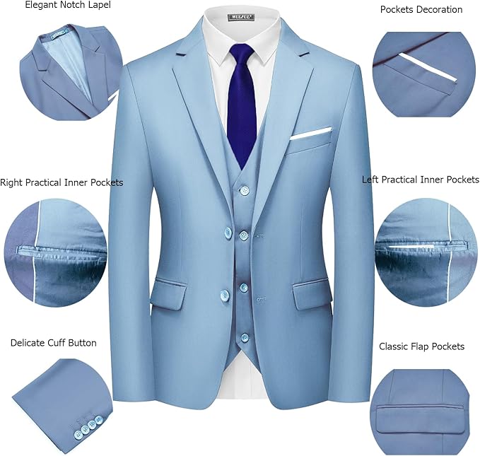 WULFUL Men’s 3 Piece Slim Fit Suit Set Two Button Celery Light Blue Blazer